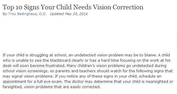 (Source: Top 10 Signs Your Child Needs Vision Correction, About.com, May 20, 2014)